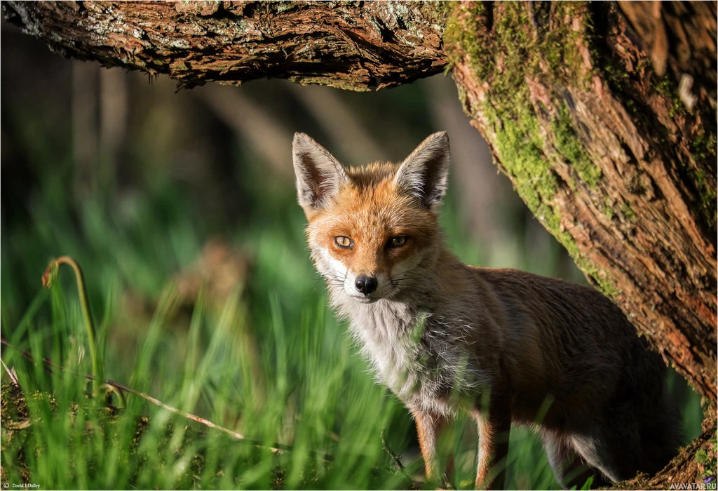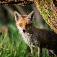 a natural setting, possibly a forest or woodland area, given the presence of trees and grass. The fox has distinctive features like its reddish-