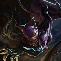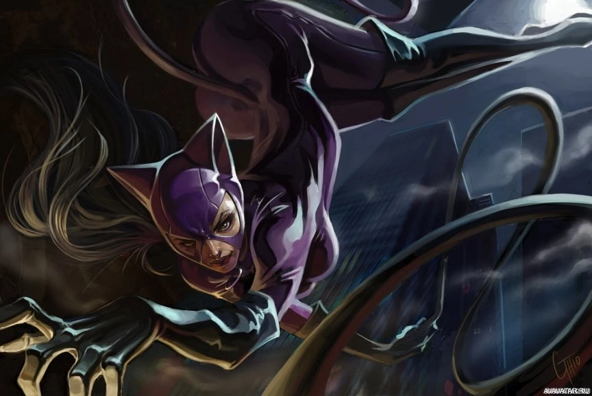 iconic costume which includes a purple bodysuit with a cowl and cat ears, along with a utility belt and claws. The background suggests an urban setting with buildings and