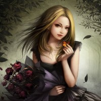 a dark forest or garden with fallen leaves and branches around her, creating a somewhat melancholic yet serene atmosphere. The artwork style suggests it could be from
