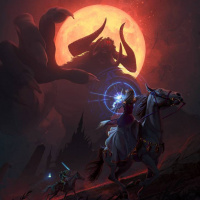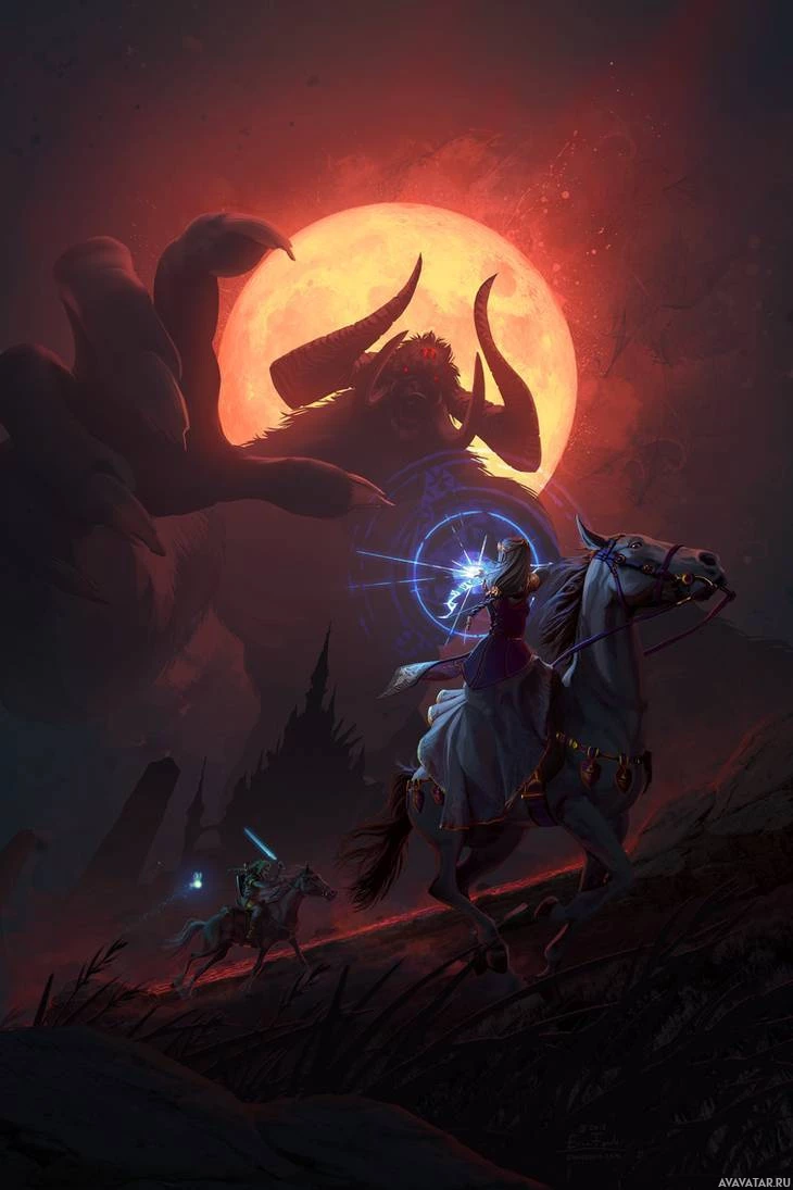 a fantasy scene where a rider on horseback is confronting a demon in the foreground. In the background, there's a castle or stronghold with a large moon or