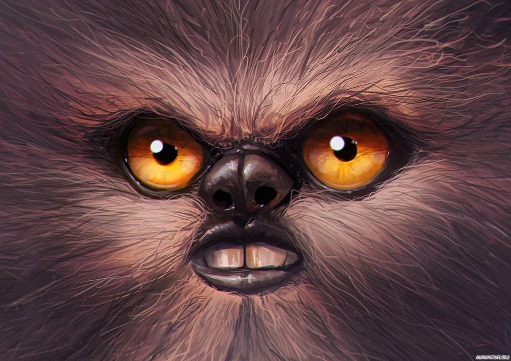 a red band around its head and has fur all over its body. The style of the image suggests it may have been digitally enhanced or artistically altered from its original appearance in the movies.