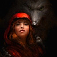 the eerie atmosphere of the image. The artwork references well-known elements from children's stories, specifically Little Red