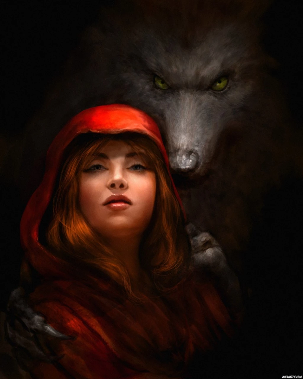 The image depicts a fantasy-themed artwork featuring a woman in a red hooded cloak, who appears to be the character Little Red Riding Hood from the traditional