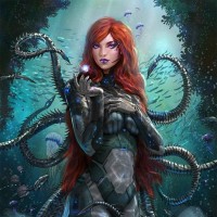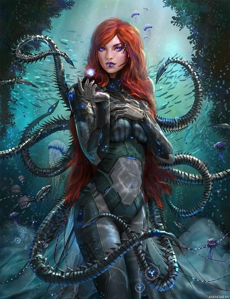 a female character with red hair, wearing what appears to be futuristic or science fiction-themed armor. She is standing underwater in an environment that resembles a marine setting, possibly a scene from a submarine or undersea