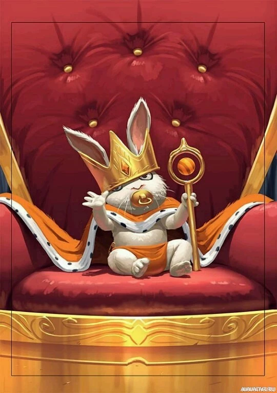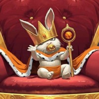 an animated rabbit depicted in a regal, king-like setting. The rabbit is wearing a crown and holding what appears to be a scepter, sitting on a throne with