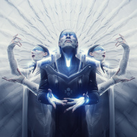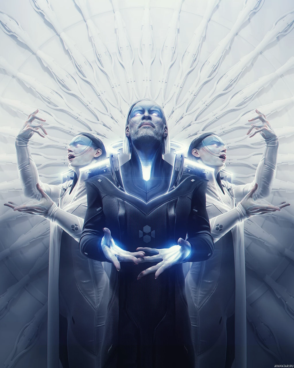 a digital display overlaying the facial features. To either side are two other figures, who seem to be responding emotionally to the central figure's presence; one has