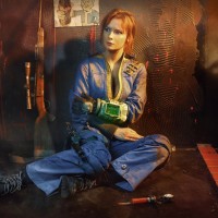 an indoor setting with a rustic look, resembling a post-apocalyptic environment typical of the "Fallout" series.