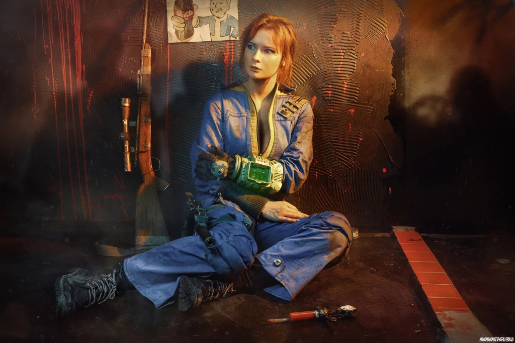 red hair and is wearing a blue military-style outfit that includes a jacket, pants, boots, and what seems to be a gas mask. In her hands, she holds a gun and what could possibly be a knife or another