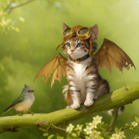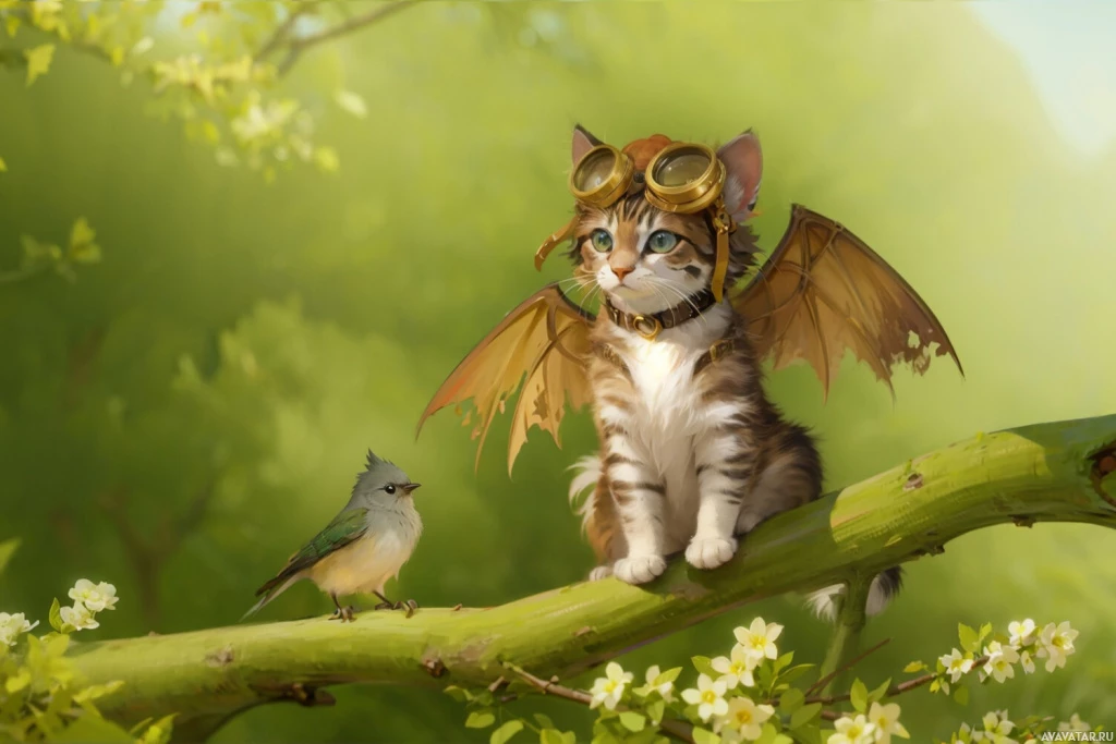 The image shows an anthropomorphic cat wearing goggles and a small pair of wings, sitting on a branch. Next to the cat is a bird perched on the branch as well. They both appear to be in a forest or park setting with trees and flowers around them.