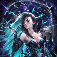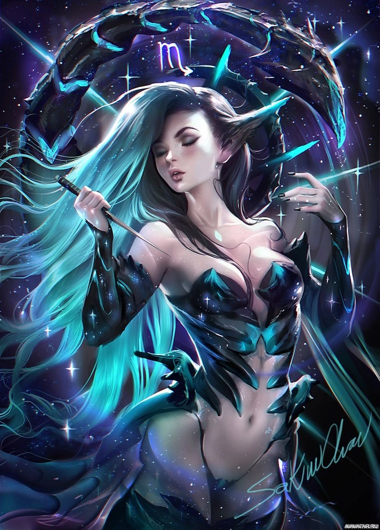 a cosmic background with stars and otherworldly energy swirling around her, contributing to a sense of magic and fantasy.