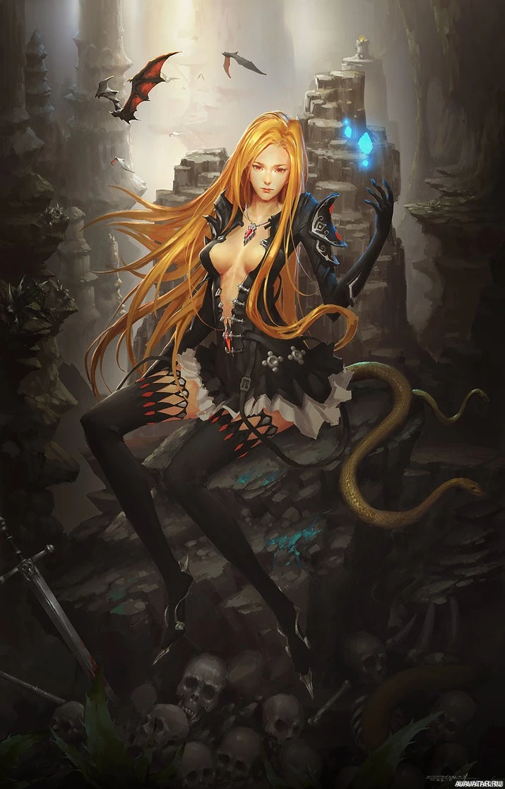 a black outfit with intricate designs and appears to be in an environment that resembles a rocky cavern or underground setting, possibly a dungeon. There are bones scattered around her, suggesting she might be in a location with