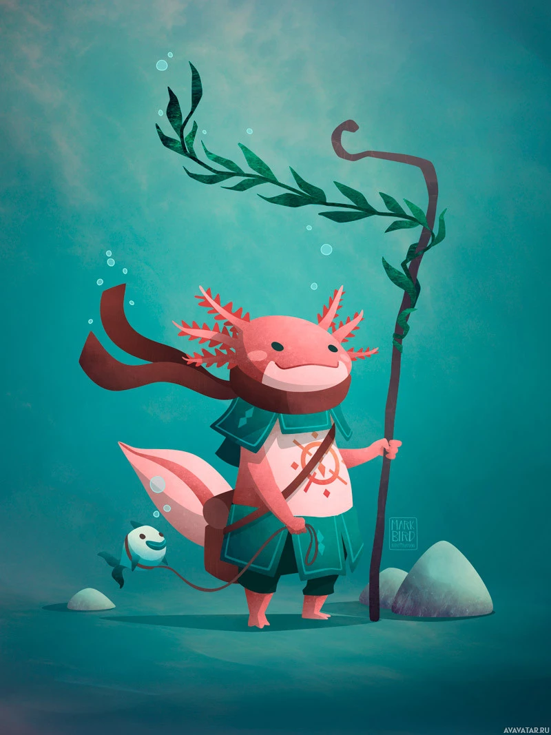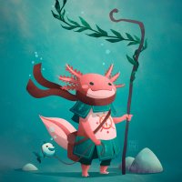 an animated character that appears to be a stylized representation of an axolotl. This character is anthropomorphized, standing upright on two legs and has