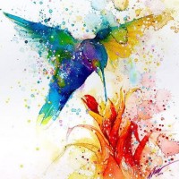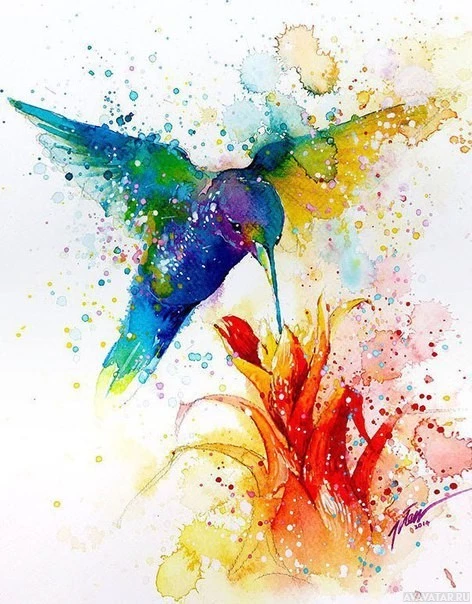 vibrant colors and dynamic motion suggested by the splashes of paint around it. It's an artistic representation that captures the bird mid-flight against a backdrop of what appears to be an explosion or burst of colorful paints, creating