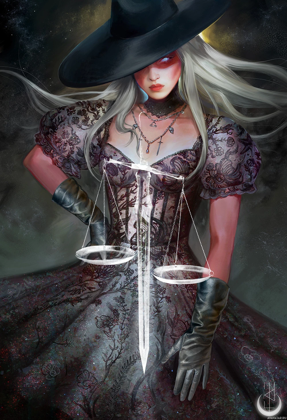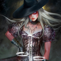 intricate designs. In her hands, she holds what looks like a pair of scales or a balance scale, which suggests a theme related to justice or balancing elements. The artwork has