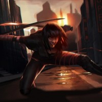 a female warrior or adventurer. She is holding a sword and appears to be either lunging forward or leaping into action. Her attire suggests that she could be from