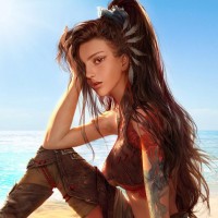 a beach scene, which indicates that she might be a warrior or a character involved in some sort of adventure or journey. She has tattoos visible on her arms, adding to her character's distinct appearance.