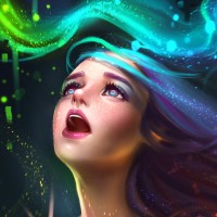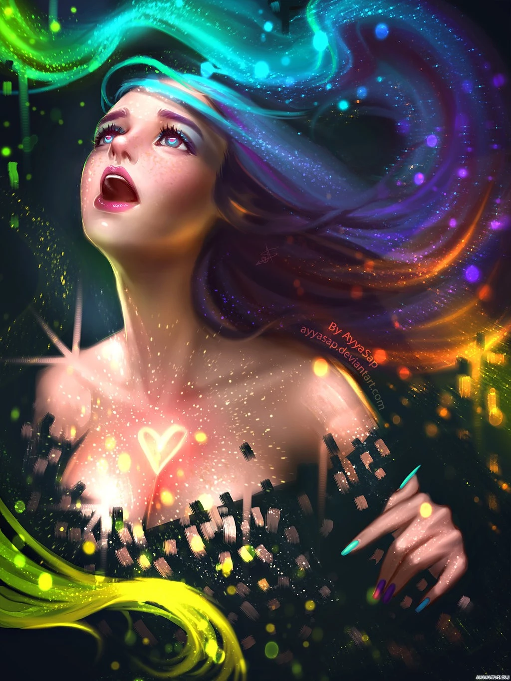 fantastical atmosphere of the image. The background has darker tones with hints of light and colorful shapes that add to
