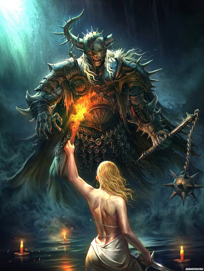 a female character looking up at a male warrior. Both characters are dressed in armor or clothing that suggests a historical or medieval setting. The warrior appears to be holding a torch, and the atmosphere is dark and moody, possibly indicating