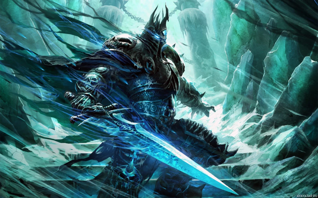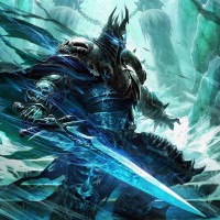 a fantasy character who appears to be a powerful figure, possibly from the Warcraft universe. The character is wearing armor and holding a sword, which suggests they might be a warrior or a leader of some kind. The setting looks like an icy,