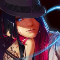 symbol in the background, which could suggest a magical or mystical theme to the character's persona or storyline. The overall tone of the artwork appears to be quite dark and moody, possibly suggesting a noir or gothic setting for the character's narrative.