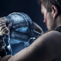 the video game "The Elder Scrolls" engaged in what appears to be a combat or training scene. One character is wearing traditional