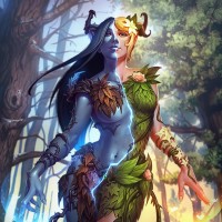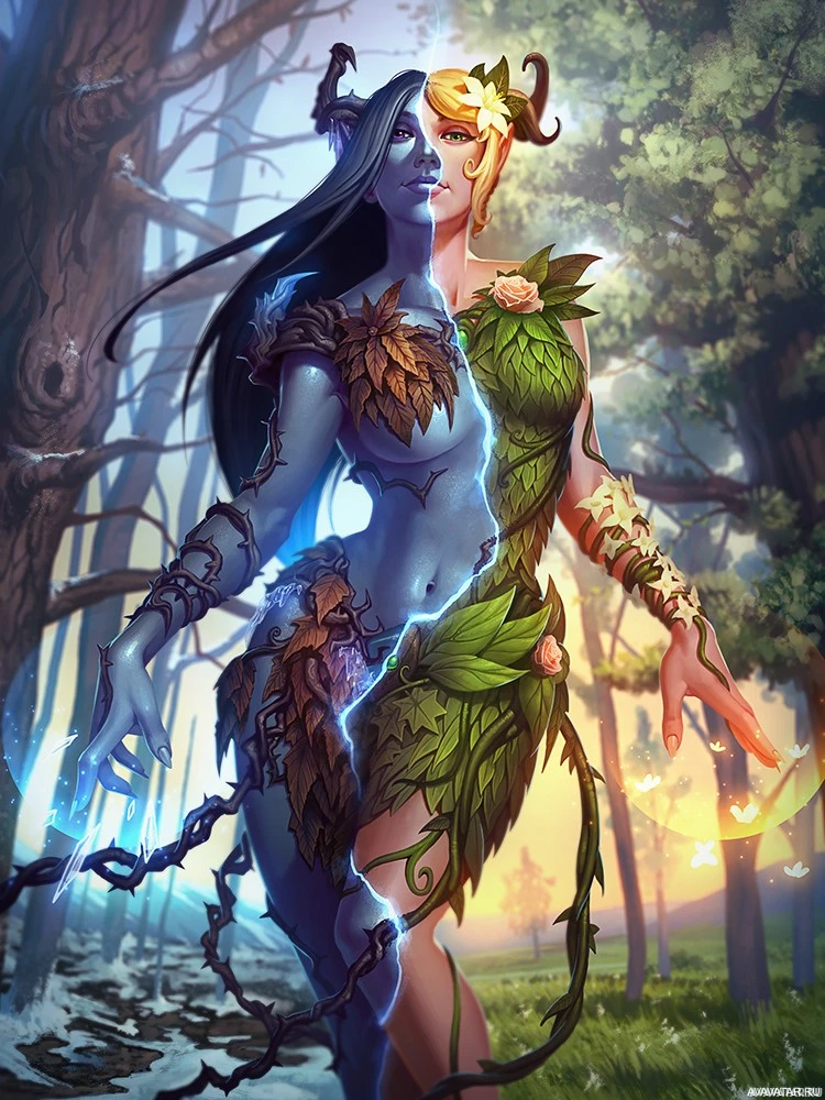 blonde hair and wearing a green dress that resembles foliage, suggesting she might be a representation of nature or an embodiment of life and growth. This character exudes a more serene and positive demeanor. Both characters are surrounded by forest scenery, with trees and a glowing light in the background that could indicate either sunrise or
