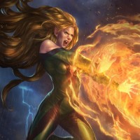 blonde hair and a fierce expression on her face. She's dressed in what looks like a green armor with elements that suggest she may possess