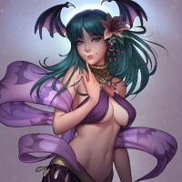 blue hair, pointed ears that resemble those of a demon or succubus, and large bat-like wings attached to her back. She is wearing an elaborate outfit with