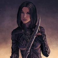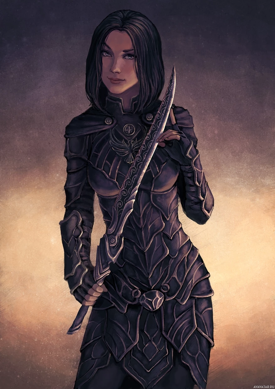 an illustrated character who appears to be a female warrior or fantasy character. She is dressed in dark,