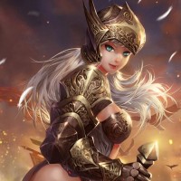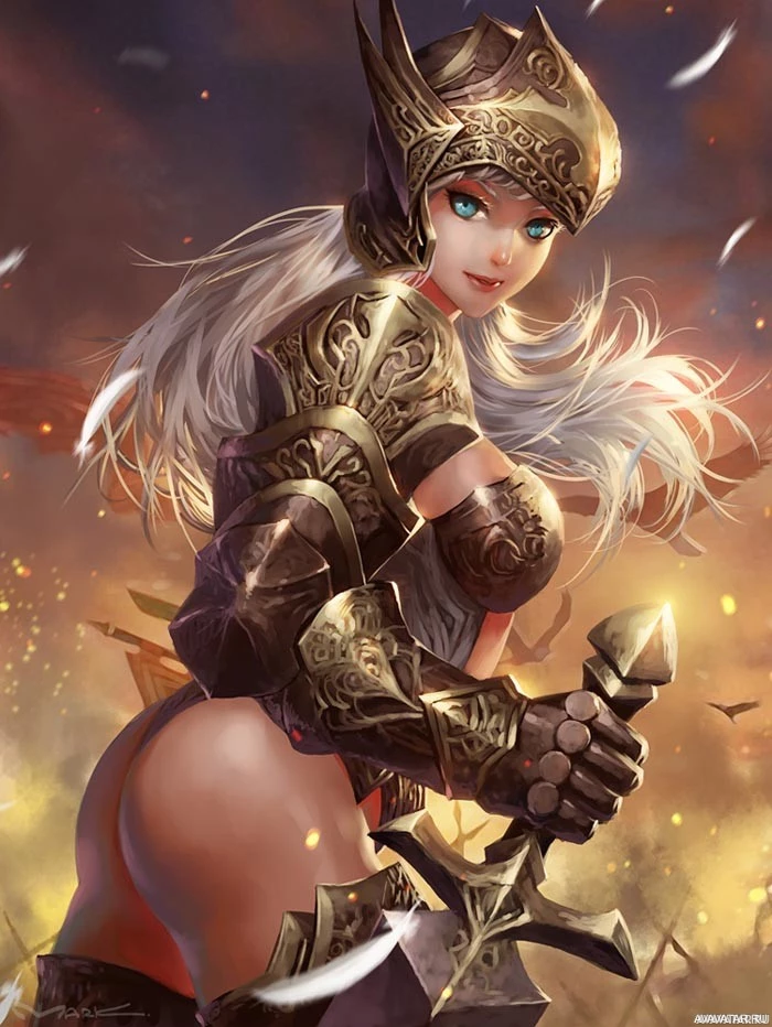 a female character dressed in fantasy armor. She is wielding a sword and appears to be standing amidst what looks like