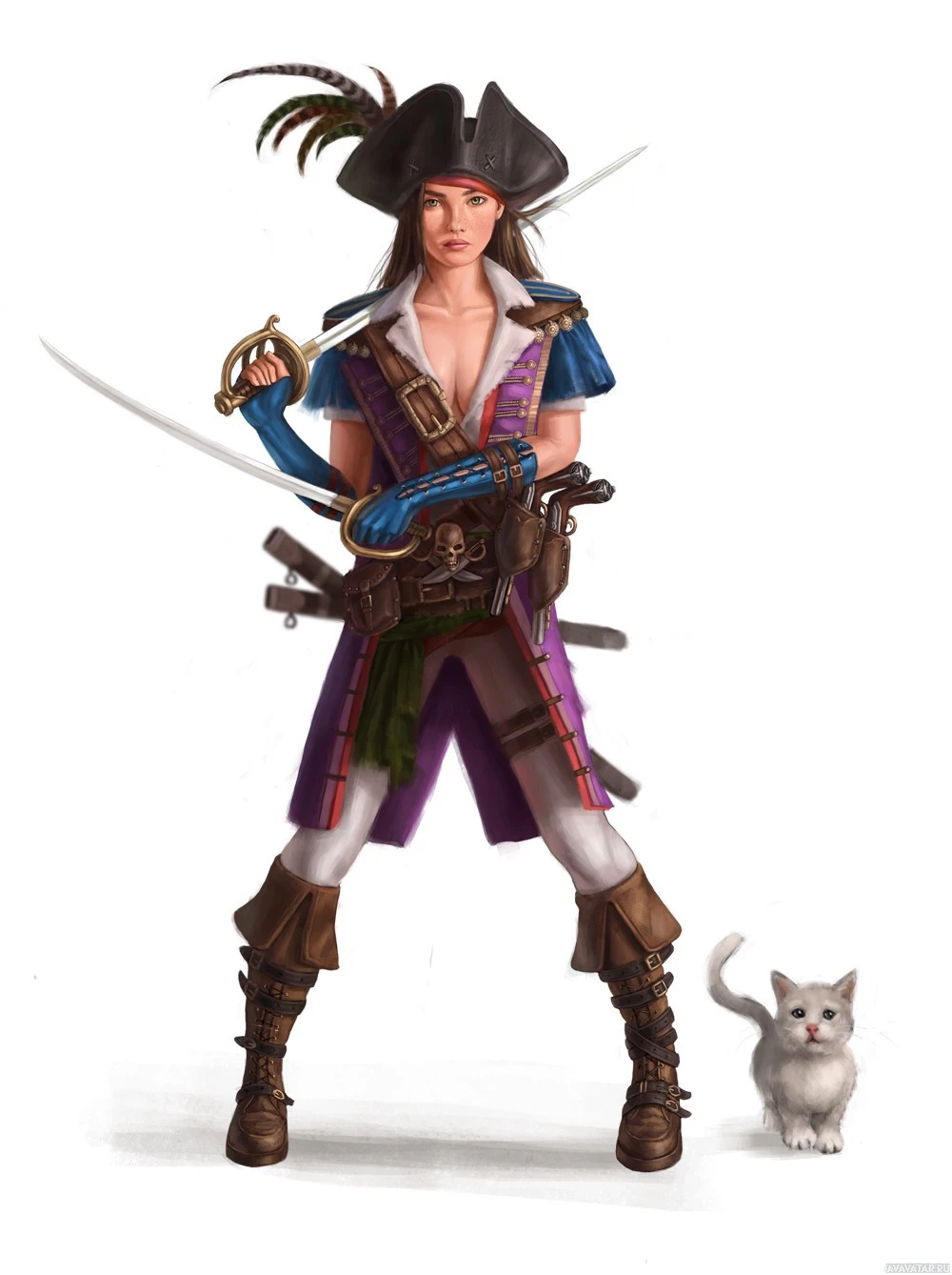 a pirate hat and has several swords strapped to her belt, indicating she might be from a story or a game where such attire is appropriate. Accompanying her is