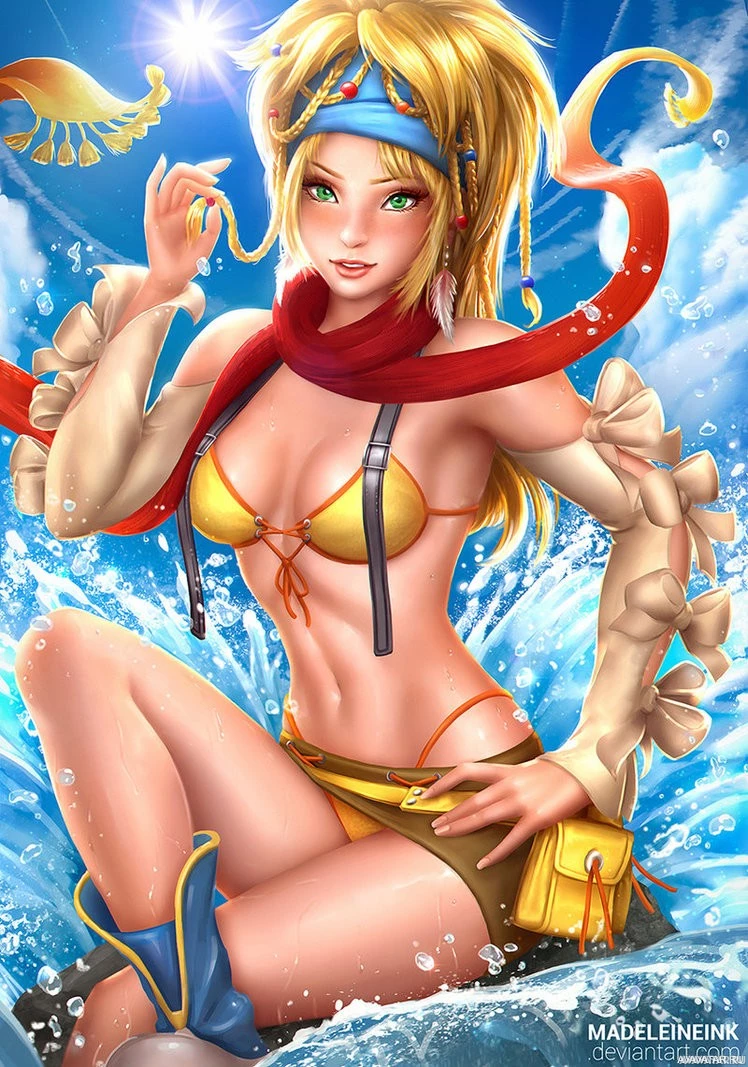 blonde hair, blue eyes, and is wearing a bikini top with an orange scarf draped around her neck. Her attire also includes a leash that appears to be attached to an anchor. She is sitting on what looks like a rock or debris in the ocean, with waves behind her. The overall style of the illustration suggests it could be related to a fantasy or adventure theme.