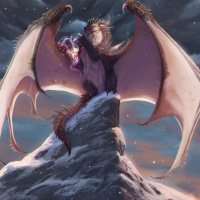 the body of a human and the wings and head of a dragon, with scales and horns. It is standing atop what appears to be a mountain peak during either sunrise or sunset, given
