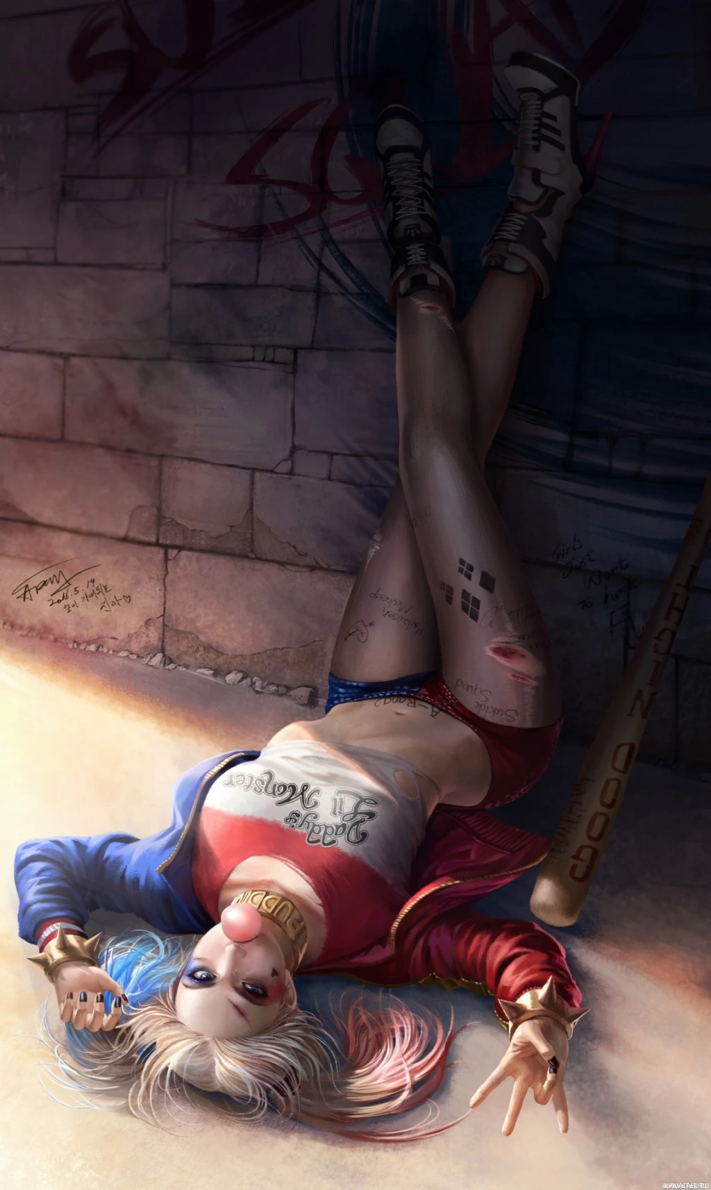 Harley Quinn, a fictional character from the Batman universe. She is depicted with her signature black and red costume and