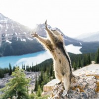 a small animal, likely a gopher or ground squirrel, perched on a rocky ledge. The creature appears to be standing on its