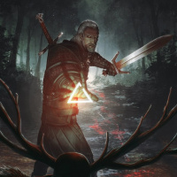 a fantasy setting, likely related to the game "The Witcher." At the center of the image is Geralt, a character known for his role in the series. He stands with one arm raised, holding a sword, and appears to be either preparing for battle or engaging in combat against two opponents. The environment around him looks like a forest at night, with misty conditions that add