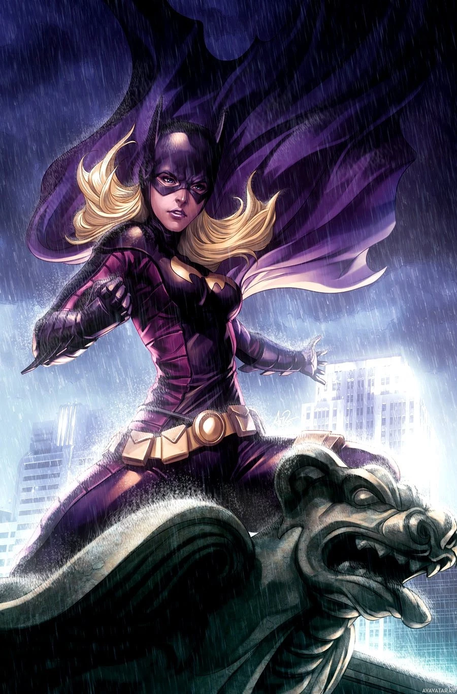 the Batman universe, specifically Batgirl. She is shown in her iconic purple and