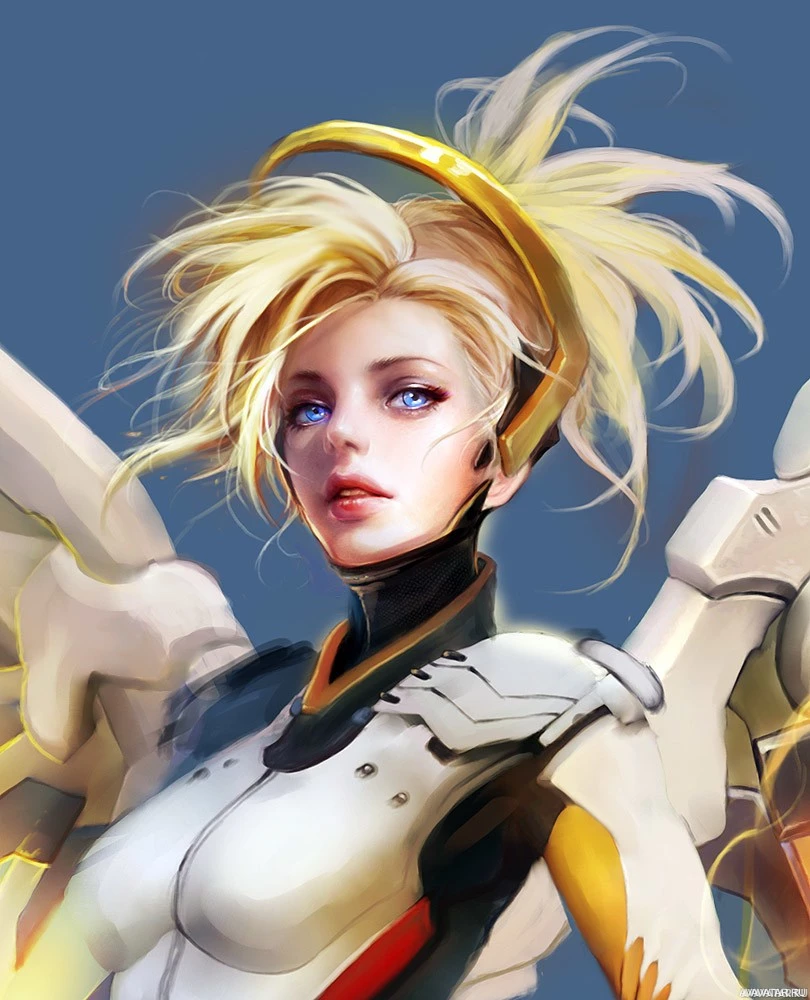 На картинке изображен анимированный персонаж, одетый в футуристическую броню и большой, богато украшенный шлем с крыльями с обеих сторон. У нее светлые волосы в грязном бобе. Это Mercy из видеоигры Overwatch.