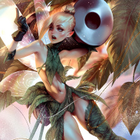 jungle setting, surrounded by lush foliage and flowers. The style suggests it could be from