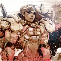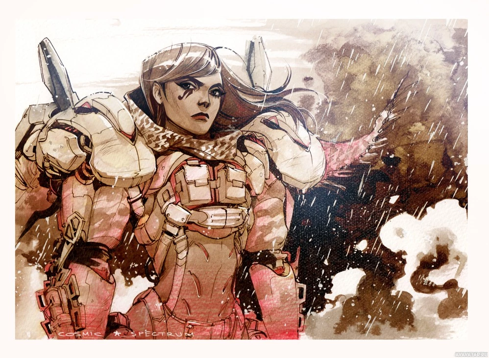 a futuristic armor, complete with a helmet that has a visor. Her pose suggests she might be on a mission or prepared for combat, and the background shows a stormy sky with rain, which adds