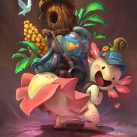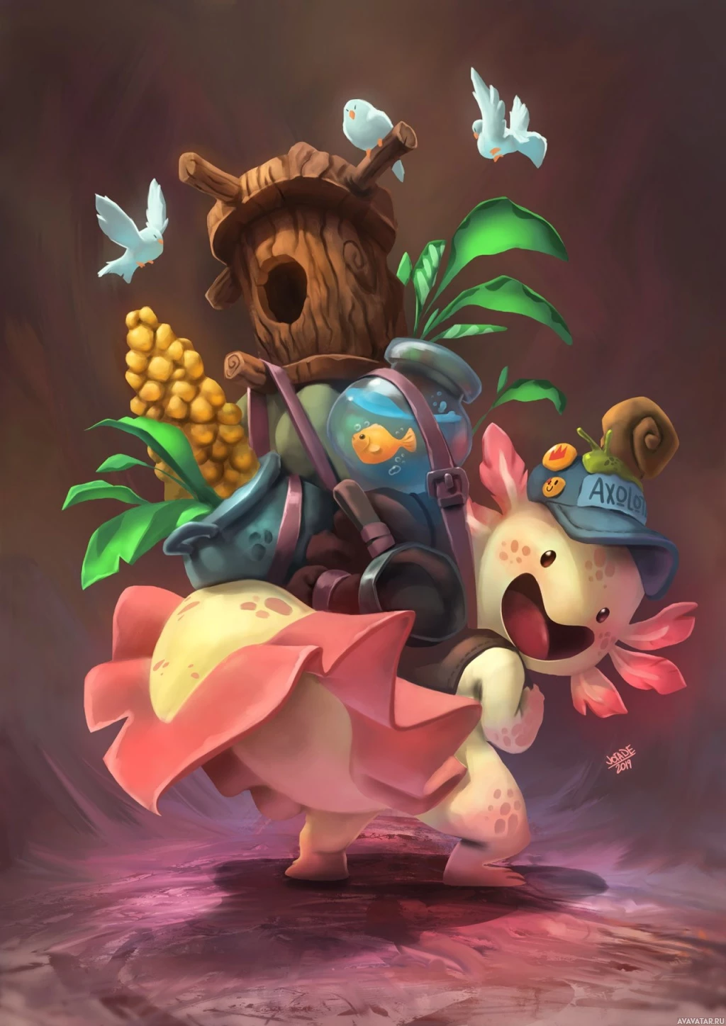 The image features a stylized, cartoonish depiction of an axolotl. This creature is characterized by its pig-like body with