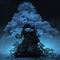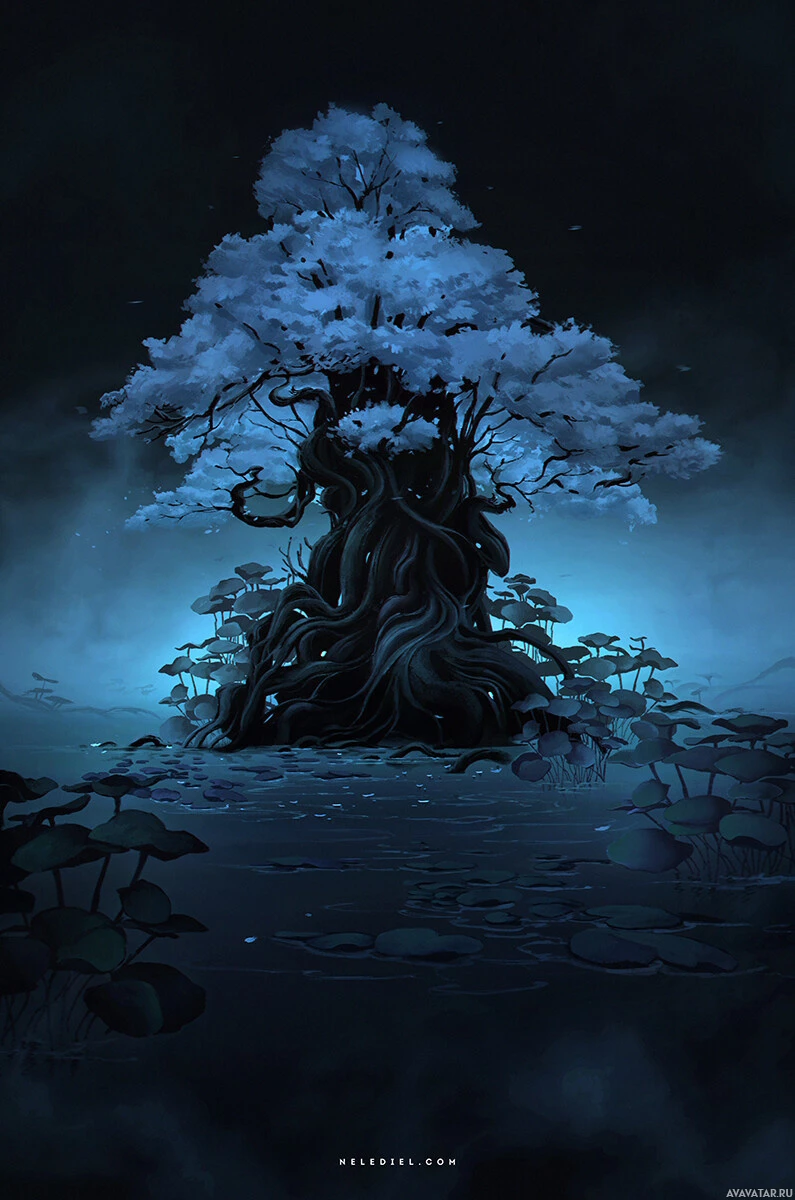 blue tones of the sky and the reflective quality of the water around the tree. The atmosphere is serene yet somewhat eerie due to