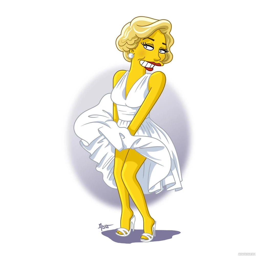 blonde hair and is dressed in a white dress that looks like it could be inspired by her iconic style. The character is smiling broadly and has one hand on her hip while the other hand is holding the dress's hem. It's a playful, colorful illustration of Marilyn Monroe in a cartoon style reminiscent of "The Simpsons," which is known for its
