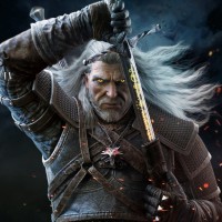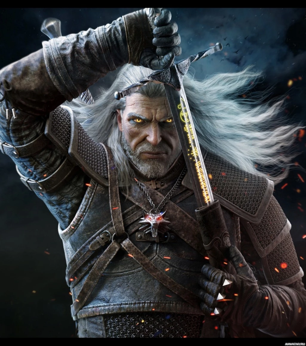 the video game series "The Witcher," known for his distinctive white hair, goatee, and the two swords he wields. He is dressed in armor that appears to be made of metal plates with