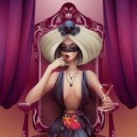a glass of wine and has one hand raised near her mouth as if she's either sipping the drink or contemplating something. The colors are rich with red and purple dominating the scene, which adds to