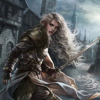 blonde hair and is wearing armor that suggests she might be a warrior or a guardian of some sort. She appears to be on horseback, with the horse's head visible at the bottom of the image. The background gives a sense of a dark or medieval environment, possibly indicating a setting within