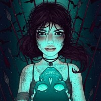 dark hair and is wearing a headband. Her expression appears contemplative or intense, with her eyes focused on something not visible in the picture. In her left hand, she holds what seems to be