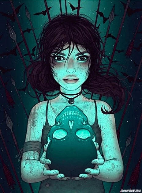 a glowing orb or ball that resembles a skull. The background suggests an underwater or subterranean setting with blue-