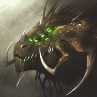 The image depicts a fantastical creature that resembles a dragon or a serpent-like monster. It has prominent features such as sharp teeth, large eyes glowing with an inner light, and what appear to be horns on its head. The design is highly stylized, with intricate details and a somewhat dark atmosphere. This type of image could be related to fantasy genres in art or literature.