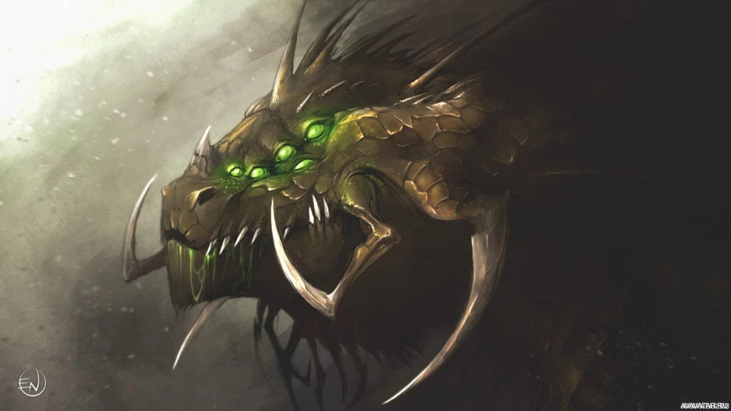 Картинка показывает фантастическое существо, напоминающее дракона или змееподобного монстра. Он имеет видные черты, такие как острые зубы, большие глаза, светящиеся внутренним светом, и то, что кажется рожками на голове. Дизайн очень стилизован, с замысловатыми деталями и несколько темной атмосферой. Этот тип изображения может быть связан с жанрами фэнтези в искусстве или литературе.